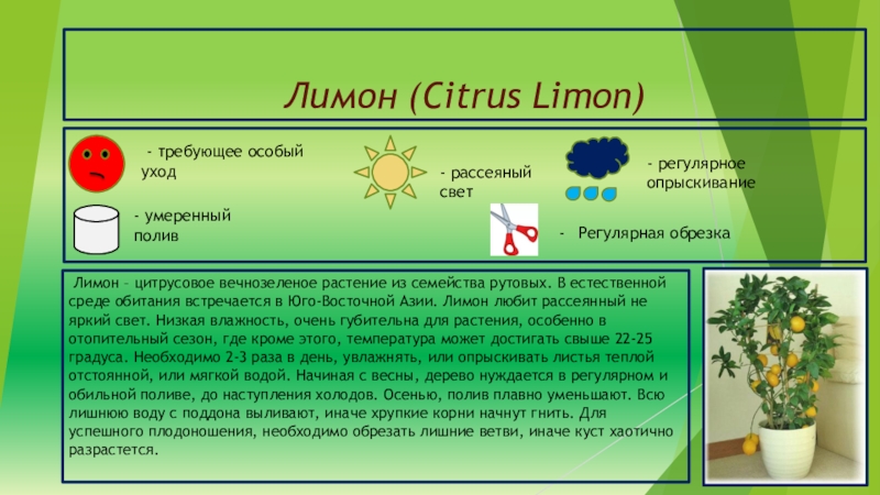 Лимон – цитрусовое вечнозеленое растение из семейства рутовых. В