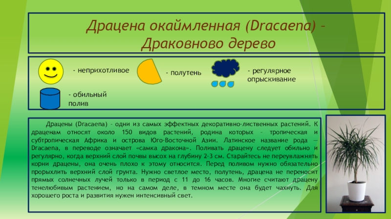 эффектных декоративно-лиственных растений. К драценам относят около 150 видов растений, родина которых – тропическая и субтропическая Африка и острова Юго-Восточной Азии. Латинское название рода — Dracaena, в переводе означает «самка дракона». Поливать драцену следует обильно и регулярно, когда верхний слой почвы высох на глубину 2-3 см. Старайтесь не переувлажнять корни драцены, она очень плохо к этому относится. Перед поливом нужно обязательно прорыхлить верхний слой грунта. Нужно светлое место, полутень, драцена не переносит прямых солнечных лучей только в период с 11 до 16 часов. Многие считают драцену тенелюбивым растением, но на самом деле, в темном месте она будет чахнуть. Для хорошего роста и развития нужен интенсивный свет.
