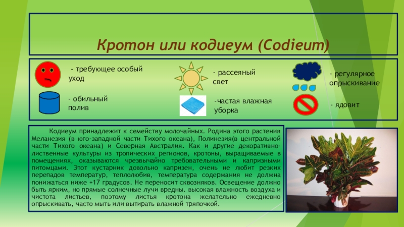 растения Меланезия (в юго-западной части Тихого океана), Полинезия(в центральной части Тихого океана) и Северная Австралия. Как и другие декоративно-лиственные культуры из тропических регионов, кротоны, выращиваемые в помещениях, оказываются чрезвычайно требовательными и капризными питомцами. Этот кустарник довольно капризен, очень не любит резких перепадов температур, теплолюбив, температура содержания не должна понижаться ниже +17 градусов. Не переносит сквозняков. Освещение должно быть ярким, но прямые солнечные лучи вредны. высокая влажность воздуха и чистота листьев, поэтому листья кротона желательно ежедневно опрыскивать, часто мыть или вытирать влажной тряпочкой.