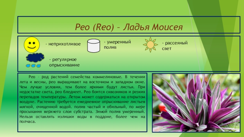 течении лета и весны, рео выращивают на восточном и западном окне. Чем лучше условия, тем более яркими будут листья. При недостатке света, рео бледнеет. Рео боится сквозняков и резких перепадов температуры. Летом может содержаться на открытом воздухе. Растению требуется ежедневное опрыскивание листьев мягкой, очищенной водой. полив частый и обильный, по мере просыхания верхнего слоя субстрата. Зимой полив умеренный. Нельзя оставлять излишки воды в поддоне, более чем на полчаса.
