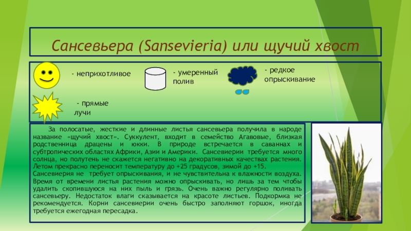 получила в народе название «щучий хвост». Суккулент, входит в семейство Агавовые, близкая родственница драцены и юкки. В природе встречается в саваннах и субтропических областях Африки, Азии и Америки. Сансевиерии требуется много солнца, но полутень не скажется негативно на декоративных качествах растения. Летом прекрасно переносит температуру до +25 градусов, зимой до +15. Сансевиерия не требует опрыскивания, и не чувствительна к влажности воздуха. Время от времени листья растения можно опрыскивать, но лишь за тем чтобы удалить скопившуюся на них пыль и грязь. Очень важно регулярно поливать сансевьеру. Недостаток влаги сказывается на красоте листьев. Подкормка не рекомендуется. Корни сансевиерии очень быстро заполняют горшок, иногда требуется ежегодная пересадка.