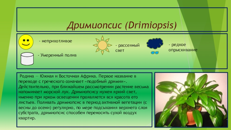 с греческого означает «подобный дримии». Действительно, при ближайшем рассмотрении растение весьма напоминает морской лук. Дримиопсису нужен яркий свет, именно при ярком освещении проявляется вся красота его листьев. Поливать дримиопсис в период активной вегетации (с весны до осени) регулярно, по мере подсыхания верхнего слоя субстрата, дримиопсис способен переносить сухой воздух квартир.
