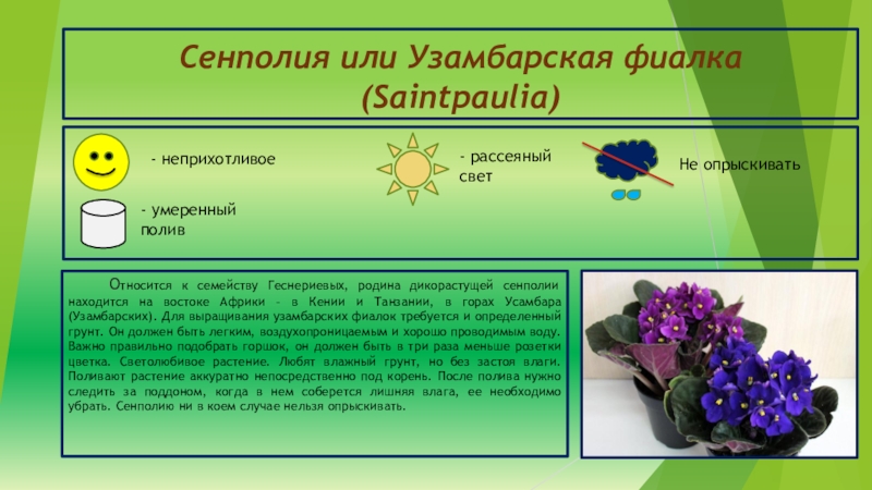 сенполии находится на востоке Африки – в Кении и Танзании, в горах Усамбара (Узамбарских). Для выращивания узамбарских фиалок требуется и определенный грунт. Он должен быть легким, воздухопроницаемым и хорошо проводимым воду. Важно правильно подобрать горшок, он должен быть в три раза меньше розетки цветка. Светолюбивое растение. Любят влажный грунт, но без застоя влаги. Поливают растение аккуратно непосредственно под корень. После полива нужно следить за поддоном, когда в нем соберется лишняя влага, ее необходимо убрать. Сенполию ни в коем случае нельзя опрыскивать.