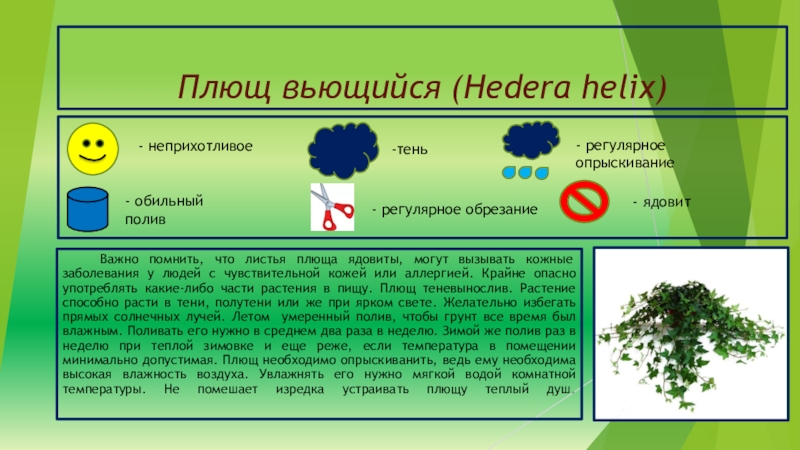 вызывать кожные заболевания у людей с чувствительной кожей или аллергией. Крайне опасно употреблять какие-либо части растения в пищу. Плющ теневынослив. Растение способно расти в тени, полутени или же при ярком свете. Желательно избегать прямых солнечных лучей. Летом умеренный полив, чтобы грунт все время был влажным. Поливать его нужно в среднем два раза в неделю. Зимой же полив раз в неделю при теплой зимовке и еще реже, если температура в помещении минимально допустимая. Плющ необходимо опрыскиванить, ведь ему необходима высокая влажность воздуха. Увлажнять его нужно мягкой водой комнатной температуры. Не помешает изредка устраивать плющу теплый душ.