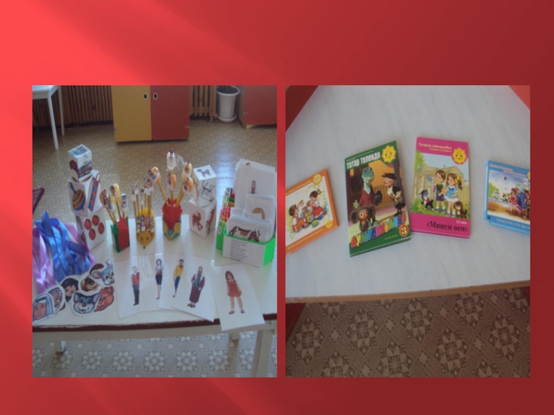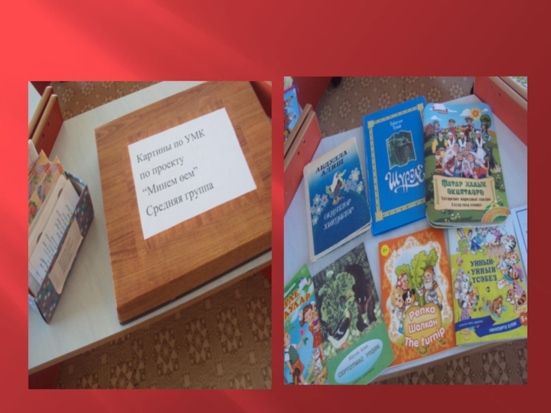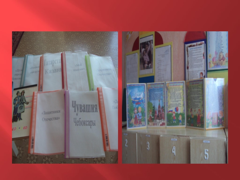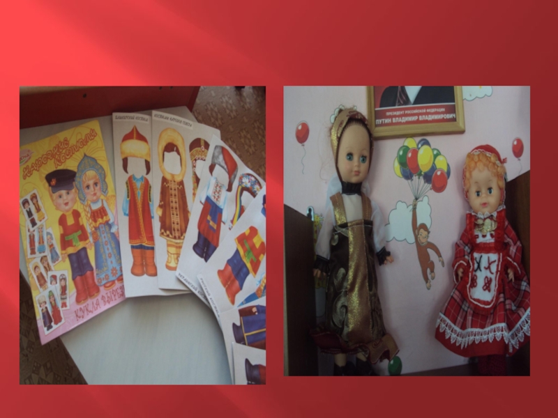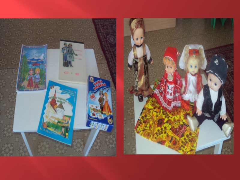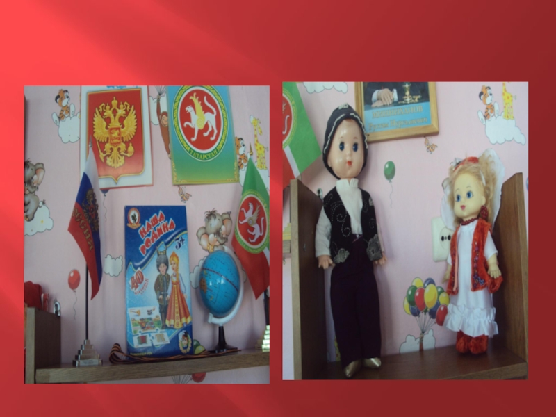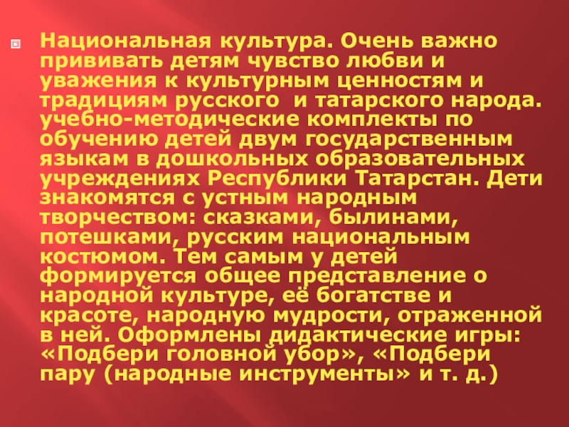 культурным ценностям и традициям русского и татарского народа. учебно-методические комплекты по обучению детей двум государственным языкам в дошкольных образовательных учреждениях Республики Татарстан. Дети знакомятся с устным народным творчеством: сказками, былинами, потешками, русским национальным костюмом. Тем самым у детей формируется общее представление о народной культуре, её богатстве и красоте, народную мудрости, отраженной в ней. Оформлены дидактические игры: «Подбери головной убор», «Подбери пару (народные инструменты» и т. д.)