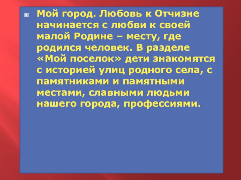 Родине – месту, где родился человек. В разделе «Мой поселок» дети знакомятся с историей улиц родного села, с памятниками и памятными местами, славными людьми нашего города, профессиями.
