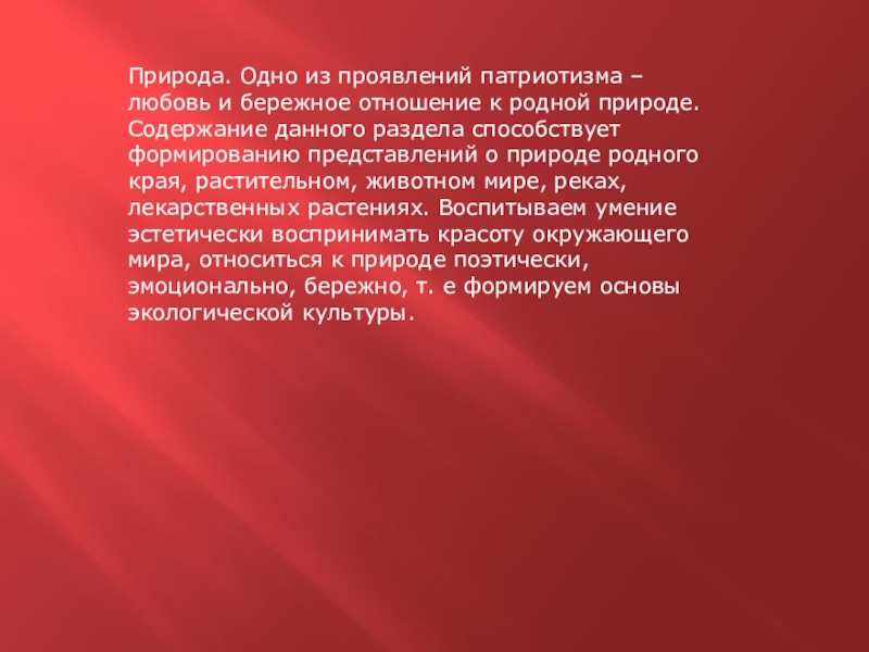 Слайд 17Природа. Одно из проявлений патриотизма – любовь и бережное отношение к