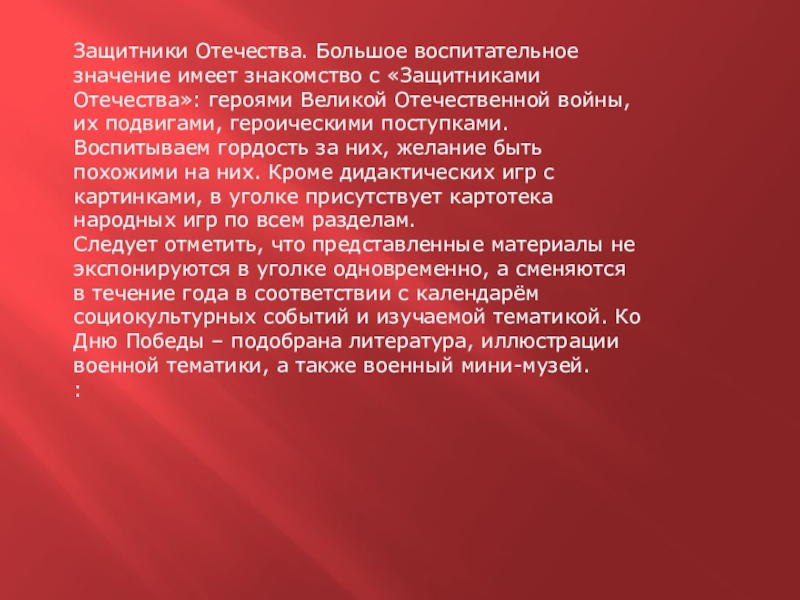Великой Отечественной войны, их подвигами, героическими поступками. Воспитываем гордость за них, желание быть похожими на них. Кроме дидактических игр с картинками, в уголке присутствует картотека народных игр по всем разделам.