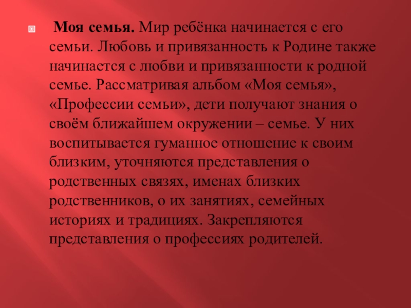 привязанность к Родине также начинается с любви и привязанности к родной семье. Рассматривая альбом «Моя семья», «Профессии семьи», дети получают знания о своём ближайшем окружении – семье. У них воспитывается гуманное отношение к своим близким, уточняются представления о родственных связях, именах близких родственников, о их занятиях, семейных историях и традициях. Закрепляются представления о профессиях родителей.
