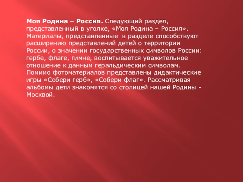 Слайд 10Моя Родина – Россия. Следующий раздел, представленный в уголке, «Моя Родина –