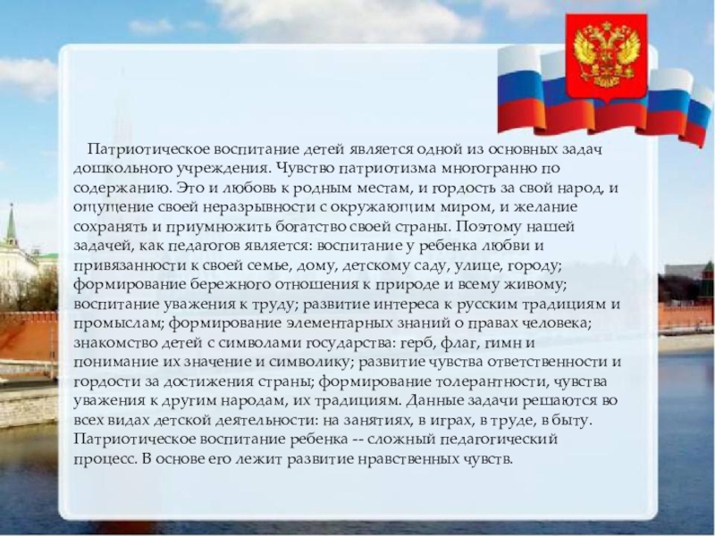 патриотизма многогранно по содержанию. Это и любовь к родным местам, и гордость за свой народ, и ощущение своей неразрывности с окружающим миром, и желание сохранять и приумножить богатство своей страны. Поэтому нашей задачей, как педагогов является: воспитание у ребенка любви и привязанности к своей семье, дому, детскому саду, улице, городу; формирование бережного отношения к природе и всему живому; воспитание уважения к труду; развитие интереса к русским традициям и промыслам; формирование элементарных знаний о правах человека; знакомство детей с символами государства: герб, флаг, гимн и понимание их значение и символику; развитие чувства ответственности и гордости за достижения страны; формирование толерантности, чувства уважения к другим народам, их традициям. Данные задачи решаются во всех видах детской деятельности: на занятиях, в играх, в труде, в быту. Патриотическое воспитание ребенка -- сложный педагогический процесс. В основе его лежит развитие нравственных чувств.