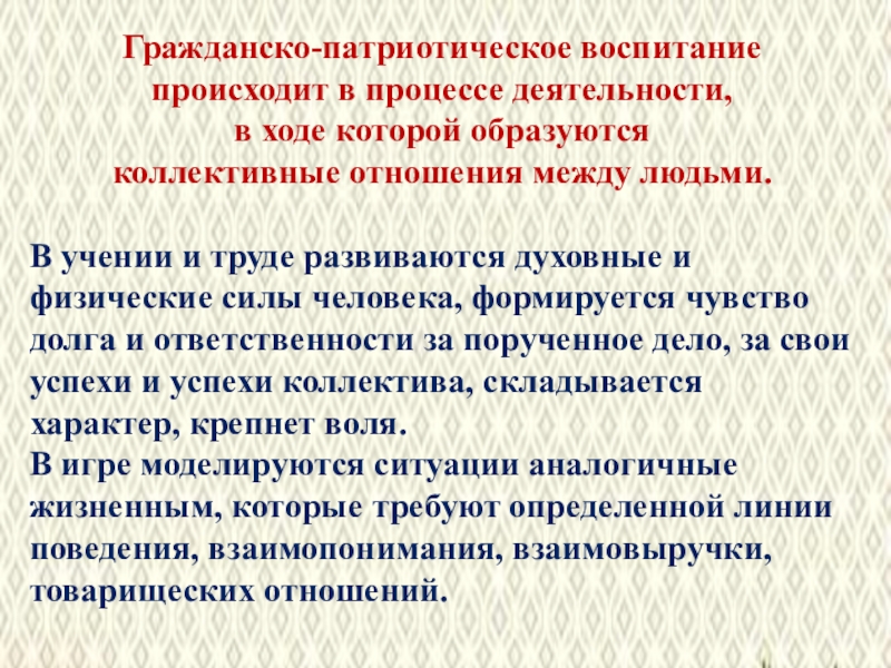Слайд 52Гражданско-патриотическое воспитание происходит в процессе деятельности,