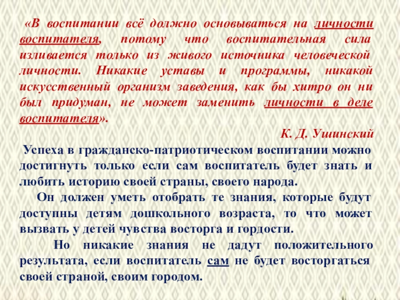 Слайд 2 «В воспитании всё должно основываться на личности воспитателя, потому что