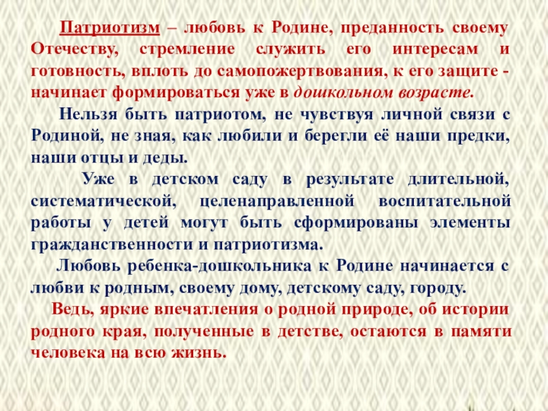 служить его интересам и готовность, вплоть до самопожертвования, к его защите - начинает формироваться уже в дошкольном возрасте.