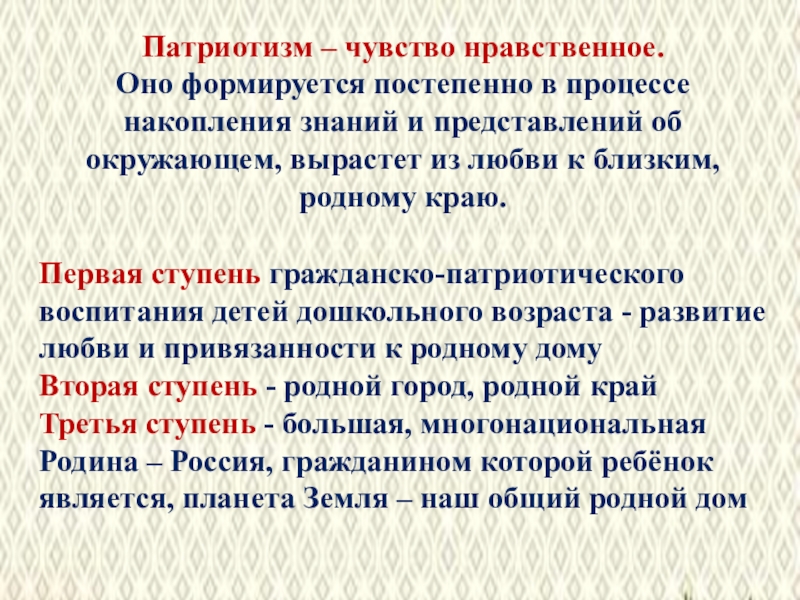 Оно формируется постепенно в процессе накопления знаний и представлений об окружающем, вырастет из любви к близким, родному краю.