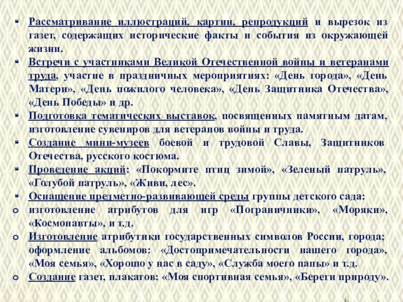 Изготовление атрибутики государственных символов России, города; оформление альбомов: «Достопримечательности нашего города», «Моя семья», «Хорошо у нас в саду», «Служба моего папы» и т.д.