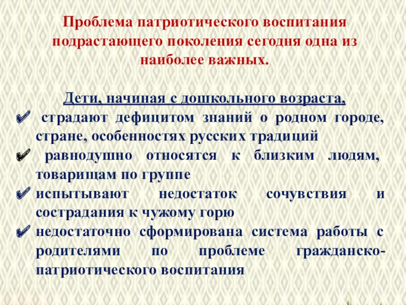 Слайд 5Проблема патриотического воспитания подрастающего поколения сегодня одна из наиболее важных.