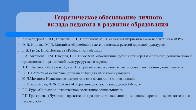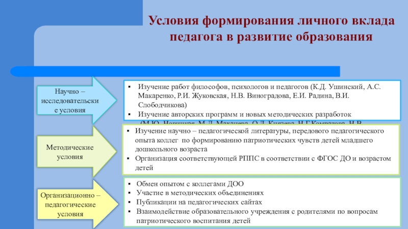Изучение работ философов, психологов и педагогов (К.Д. Ушинский, А.С. Макаренко, Р.И. Жуковская, Н.В. Виноградова, Е.И. Радина, В.И. Слободчикова)