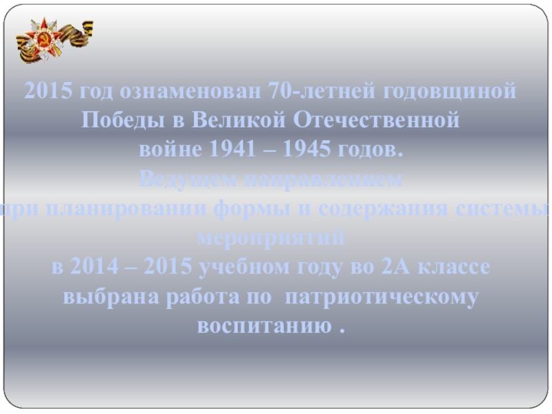 2015 год ознаменован 70-летней годовщиной Победы в Великой Отечественной войне 1941 – 1945 годов. Ведущем направлением при планировании формы и содержания системы мероприятий в 2014 – 2015 учебном году во 2А классе выбрана работа по