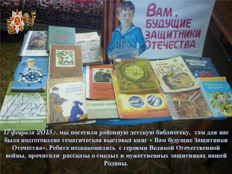 была подготовлена тематическая выставка книг « Вам будущие Защитники Отечества». Ребята познакомились с героями Великой Отечественной войны, прочитали рассказы о смелых и мужественных защитниках нашей Родины.