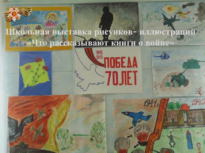 Слайд 16Школьная выставка рисунков- иллюстраций «Что рассказывают книги о войне»
