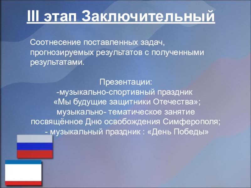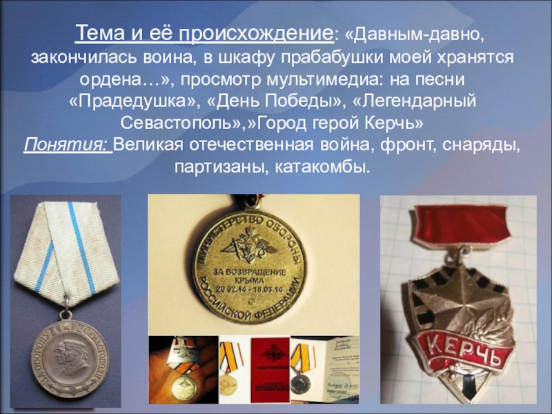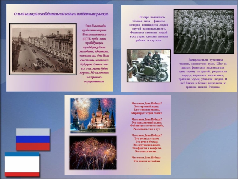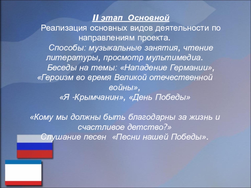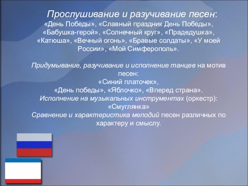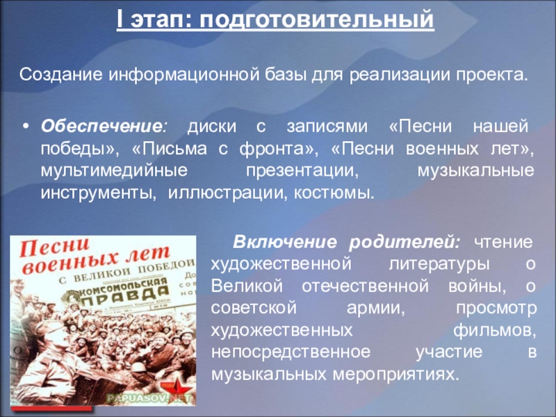 Обеспечение: диски с записями «Песни нашей победы», «Письма с фронта», «Песни военных лет», мультимедийные презентации, музыкальные инструменты, иллюстрации, костюмы.