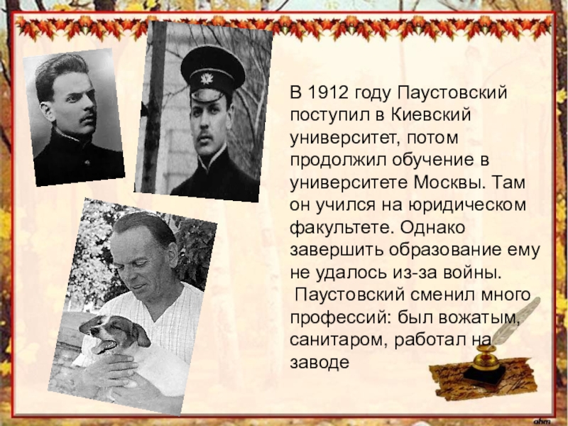 Слайд 3В 1912 году Паустовский поступил в Киевский университет, потом продолжил обучение