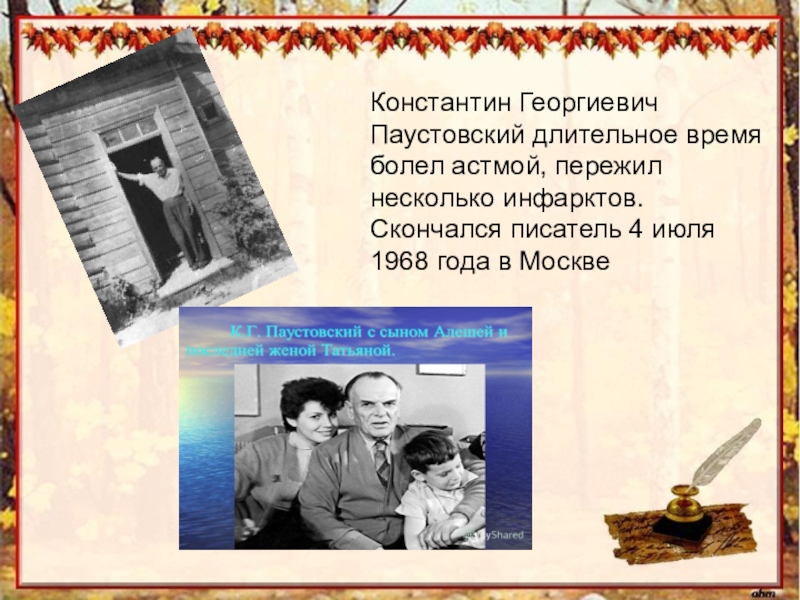 Слайд 6Константин Георгиевич Паустовский длительное время болел астмой, пережил несколько инфарктов. Скончался
