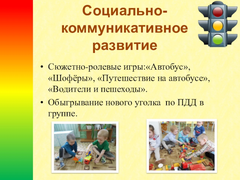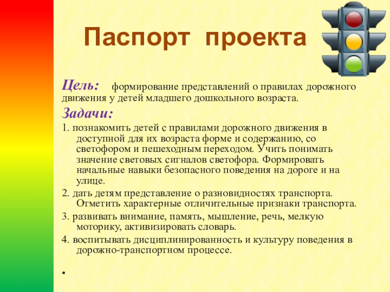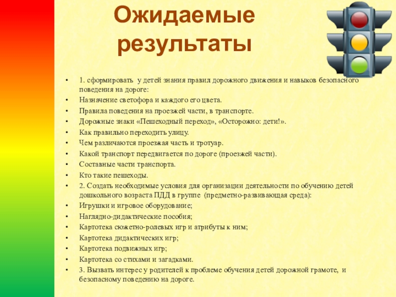 1. познакомить детей с правилами дорожного движения в доступной для их возраста форме и содержанию, со светофором и пешеходным переходом. Учить понимать значение световых сигналов светофора. Формировать начальные навыки безопасного поведения на дороге и на улице.