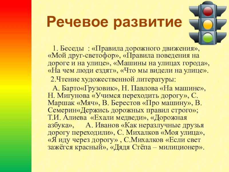 А. Барто«Грузовик», Н. Павлова «На машине», Н. Мигунова «Учимся переходить дорогу», С. Маршак «Мяч», В. Берестов «Про машину», В.Семерин«Держись дорожных правил строго»; Т.И. Алиева «Ехали медведи», «Дорожная азбука», А. Иванов «Как неразлучные друзья дорогу переходили», С. Михалков «Моя улица», «Я иду через дорогу» , С.Михалков «Если свет зажёгся красный», «Дядя Стёпа – милиционер».