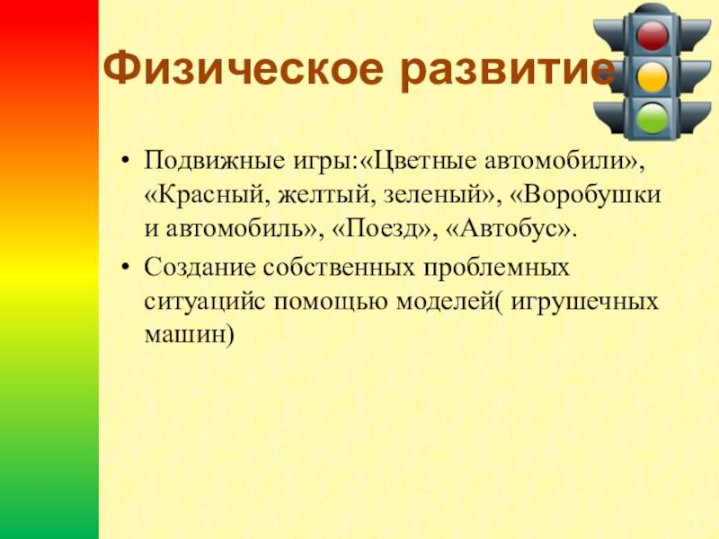 Подвижные игры:«Цветные автомобили», «Красный, желтый, зеленый», «Воробушки и автомобиль», «Поезд»,