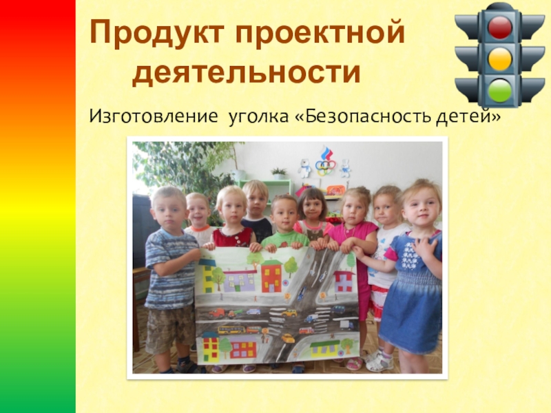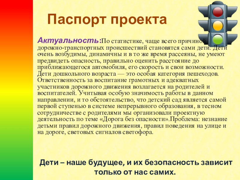дети. Дети очень возбудимы, динамичны и в то же время рассеяны, не умеют предвидеть опасность, правильно оценить расстояние до приближающегося автомобиля, его скорость и свои возможности. Дети дошкольного возраста — это особая категория пешеходов. Ответственность за воспитание грамотных и адекватных участников дорожного движения возлагается на родителей и воспитателей. Учитывая особую значимость работы в данном направлении, и то обстоятельство, что детский сад является самой первой ступенью в системе непрерывного образования, в тесном сотрудничестве с родителями мы организовали проектную деятельность по теме «Дорога без опасности».Проблема: незнание детьми правил дорожного движения, правил поведения на улице и на дороге, световых сигналов светофора.