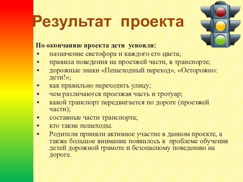 Родители приняли активное участие в данном проекте, а также большое внимание появилось к проблеме обучения детей дорожной грамоте и безопасному поведению на дороге.