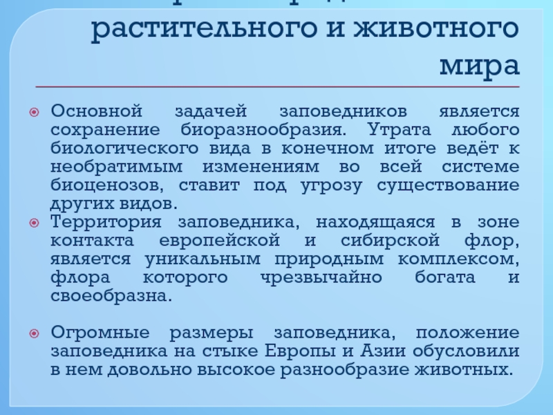 Основной задачей заповедников является сохранение биоразнообразия.