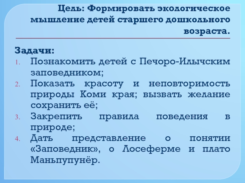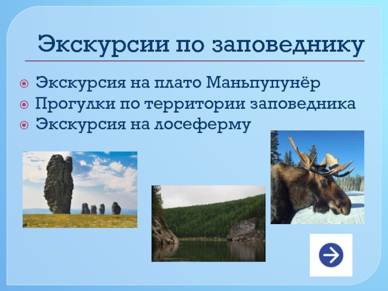 Дать представление о понятии «Заповедник», о Лосеферме и плато Маньпупунёр.