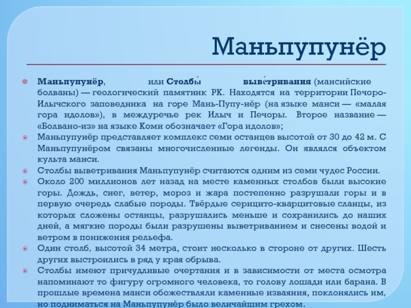Маньпупунёр, или Столбы́ выве́тривания (мансийские болваны) — геологический памятник РК. Находятся на территории Печоро-Илычского заповедника на