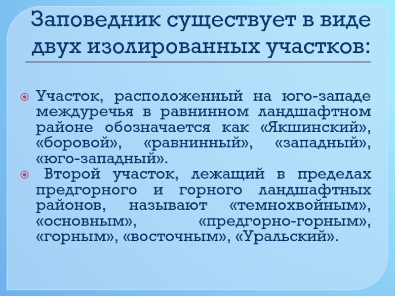 Слайд 6Заповедник существует в виде двух изолированных участков:
