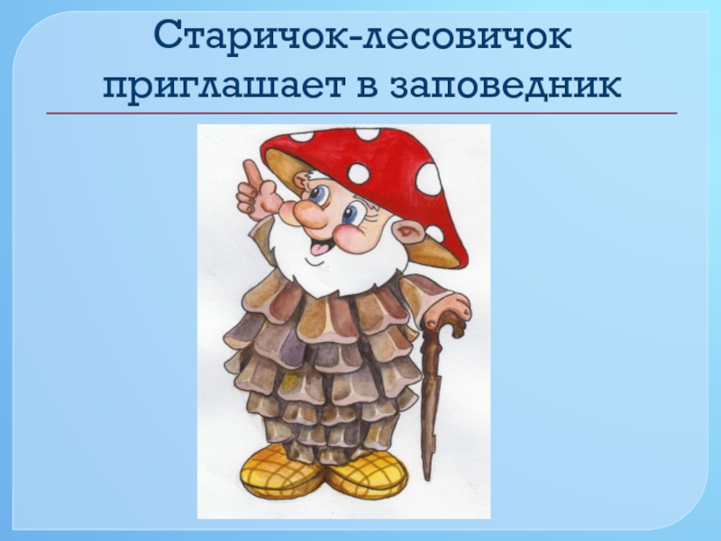 Слайд 3Старичок-лесовичок приглашает в заповедник