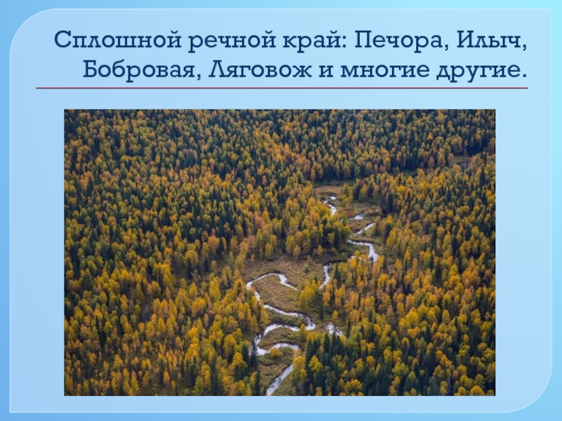 Слайд 21Сплошной речной край: Печора, Илыч, Бобровая, Ляговож и многие другие.