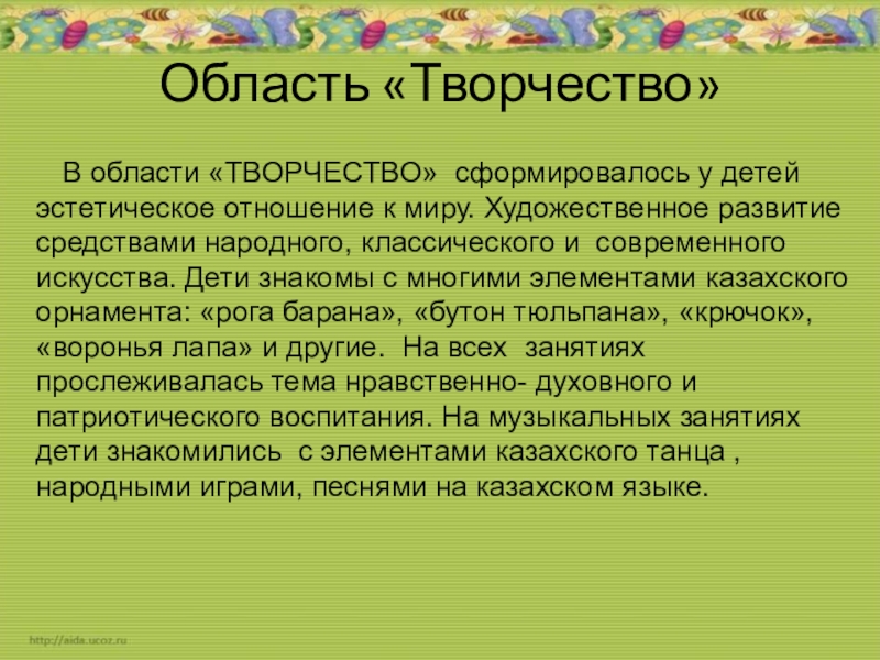 отношение к миру. Художественное развитие средствами народного, классического и современного искусства. Дети знакомы с многими элементами казахского орнамента: «рога барана», «бутон тюльпана», «крючок», «воронья лапа» и другие. На всех занятиях прослеживалась тема нравственно- духовного и патриотического воспитания. На музыкальных занятиях дети знакомились с элементами казахского танца , народными играми, песнями на казахском языке.