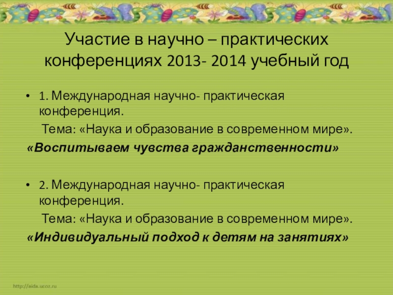 Слайд 23Участие в научно – практических конференциях 2013- 2014 учебный год