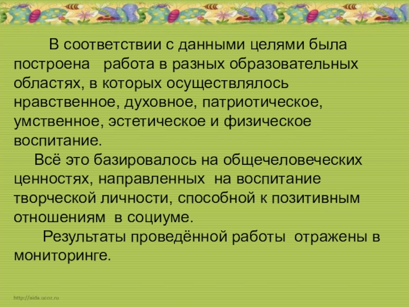 целями была построена работа в разных образовательных областях, в которых осуществлялось нравственное, духовное, патриотическое, умственное, эстетическое и физическое воспитание.