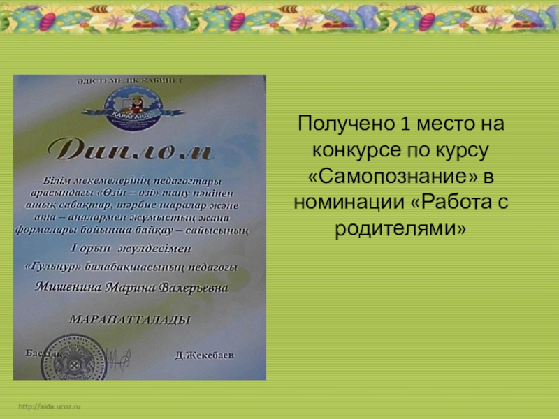 Слайд 24Получено 1 место на конкурсе по курсу «Самопознание» в номинации «Работа