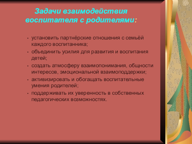 Задачи взаимодействия воспитателя с родителями:установить партнёрские отношения с семьёй каждого воспитанника;объединить усилия для развития и воспитания детей;создать атмосферу взаимопонимания, общности интересов, эмоциональной взаимоподдержки;активизировать и обогащать воспитательные умения родителей;поддерживать их уверенность в собственных педагогических возможностях.