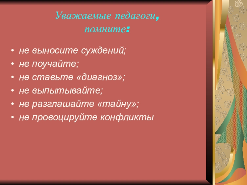 Уважаемые педагоги,  помните:не выносите суждений;не поучайте;не ставьте «диагноз»;не выпытывайте;не разглашайте «тайну»;не провоцируйте конфликты