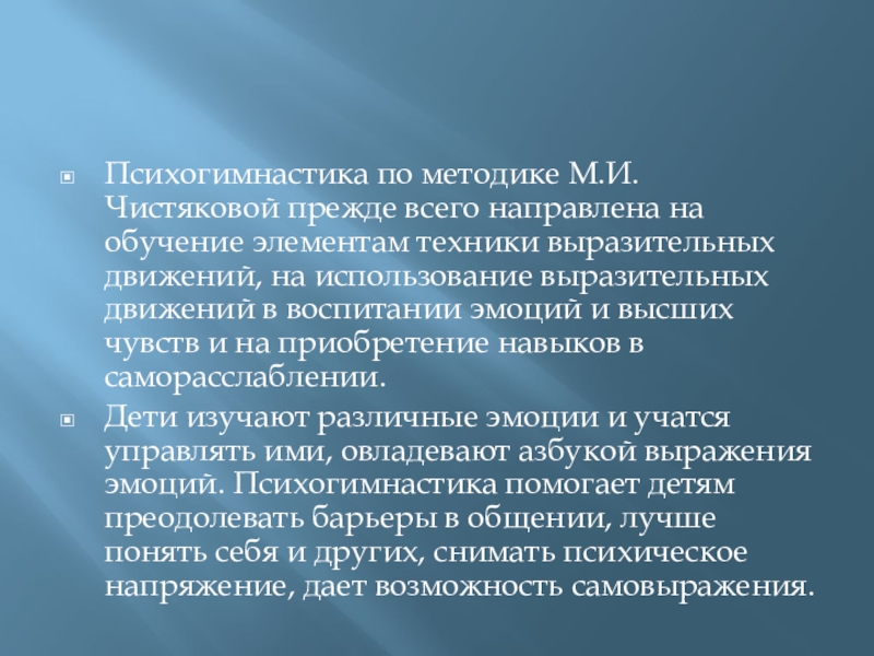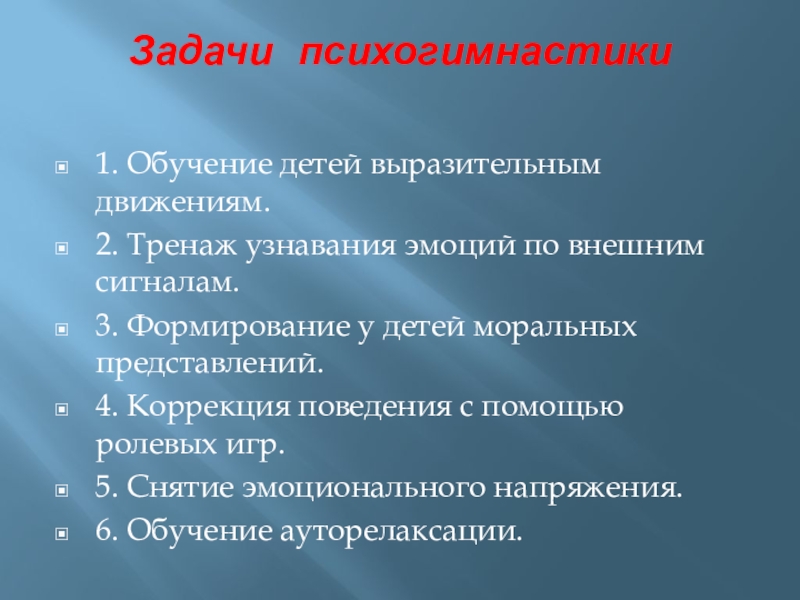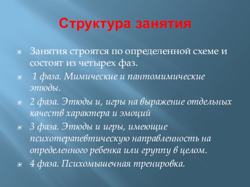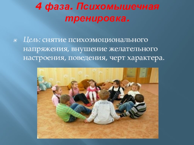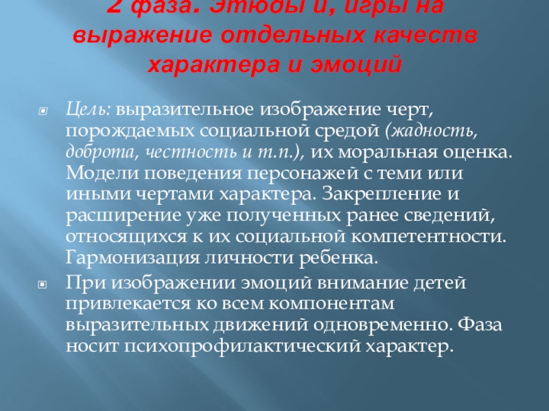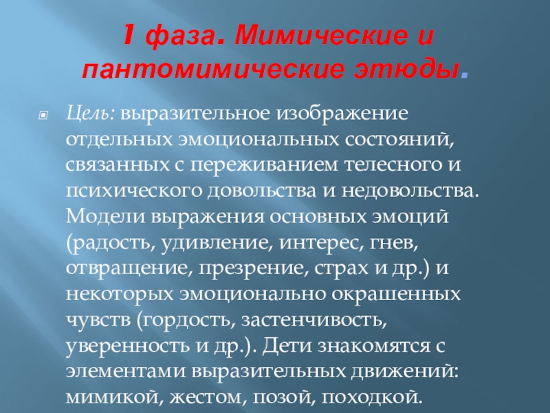 При изображении эмоций внимание детей привлекается ко всем компонентам выразительных движений одновременно. Фаза носит психопрофилактический характер.