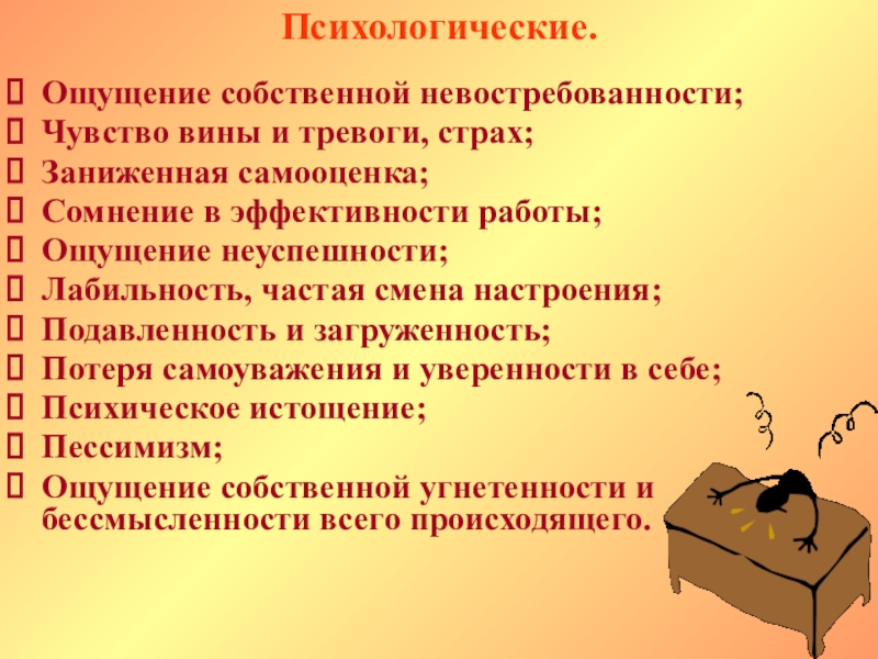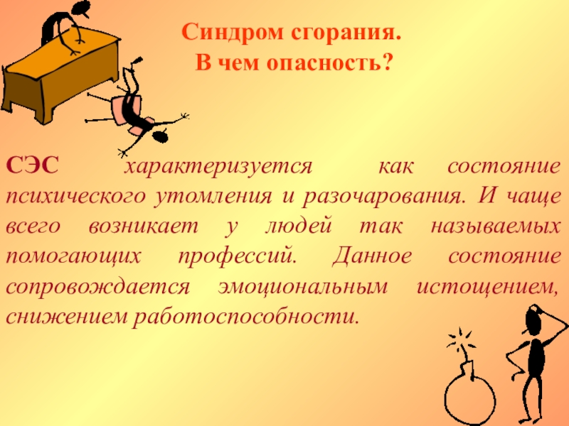 разочарования. И чаще всего возникает у людей так называемых помогающих профессий. Данное состояние сопровождается эмоциональным истощением, снижением работоспособности.