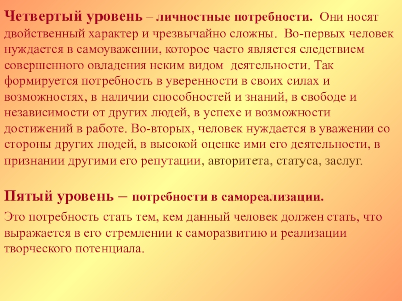 Слайд 9Четвертый уровень – личностные потребности. Они носят