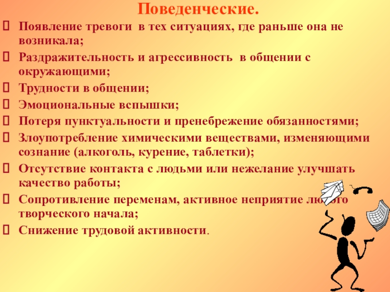 Появление тревоги в тех ситуациях, где раньше она не возникала;