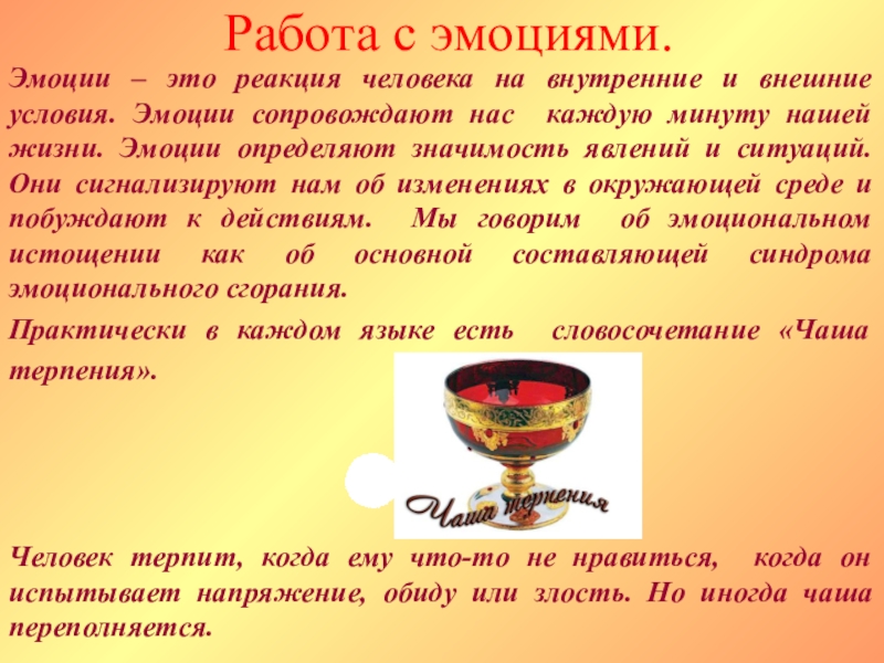 условия. Эмоции сопровождают нас каждую минуту нашей жизни. Эмоции определяют значимость явлений и ситуаций. Они сигнализируют нам об изменениях в окружающей среде и побуждают к действиям. Мы говорим об эмоциональном истощении как об основной составляющей синдрома эмоционального сгорания.